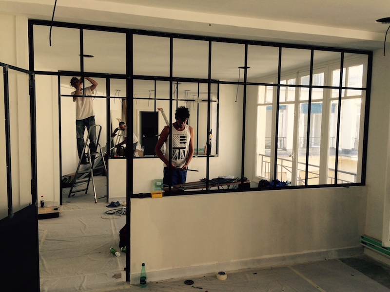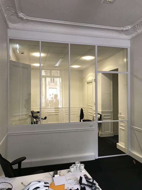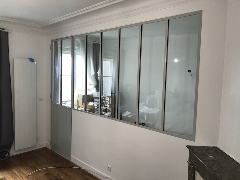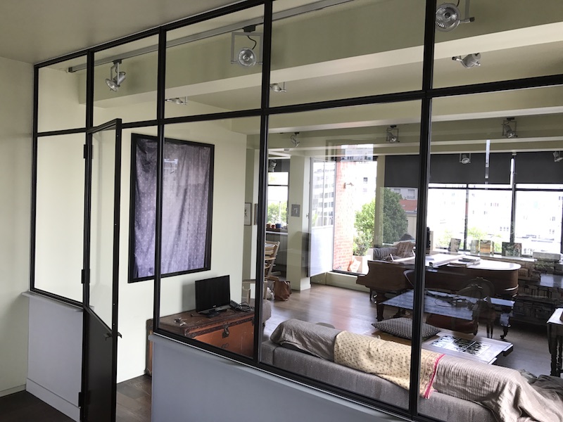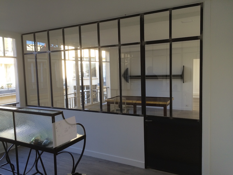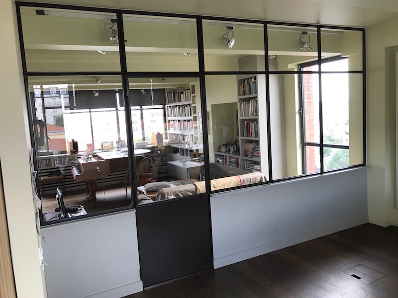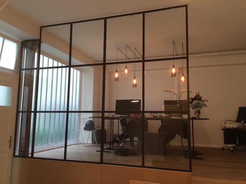 Que ce soit un bureau à votre domicile ou bien bureaux de société, cette verrière est idéale pour partager et protéger des espaces.. L’open space devient intime, la vue est dégagée, mais vous êtes isolés de vos voisins ou des bruits de la maison. Cette verrière peut être réalisée en verre 44/2 isophonique pour une meilleure efficacité, les panneaux métalliques sont doublés et isolés de laine de roche. Cette verrière intérieure allie esthétique et efficacité tout en gardant tout la luminosité ambiante.